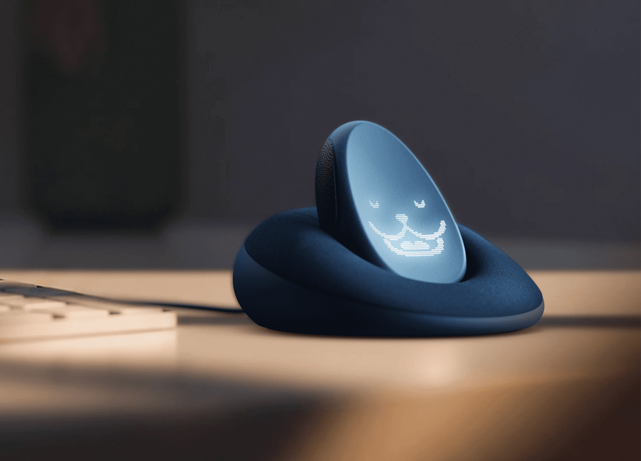 A wireless charging base mimics a dog bed. The charging base maintains the smooth pebble form language. Fabric surrounds the silicone charging points to create a cozy, home-like feel.